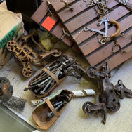 Antiques: National Brass cash register; Maytag ant. Wash machine; Thomas Home Phonograph model 177; violin; poker table; lanterns; hanging lamp; lantern; statues; wood planes; augers; spoke shaver; brass extinguisher; round table & 6 leather seat chairs; Vitalite Foosball table; 2 bronze statuette figural lamps; Waterloo & Co cast door off steam engine; Meade telescope; Don Cherry’s Rock Em Sock Em framed picture; Canadian Champion Bret Hart & George Chuvalo (signed) picture;